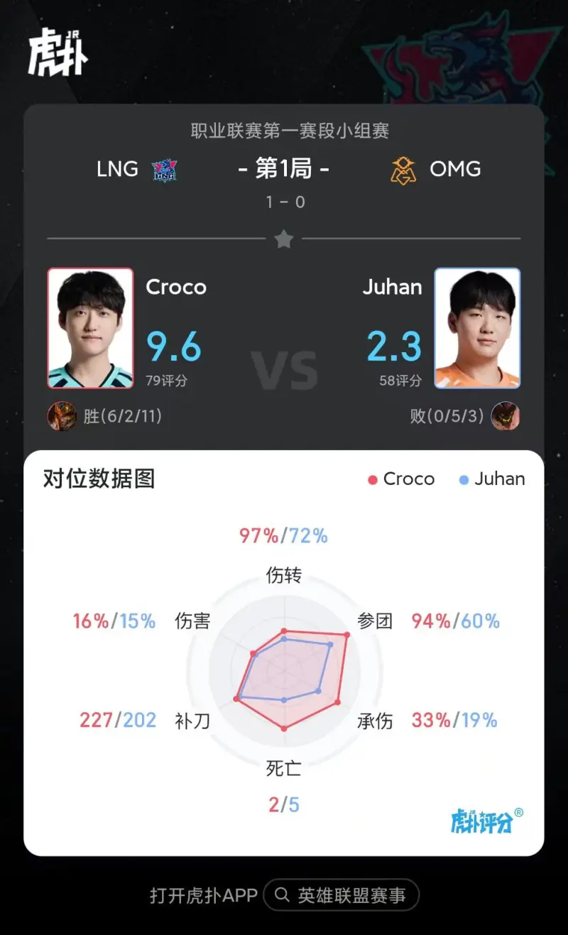 虎扑01月16日讯 在刚刚结束的LNG对阵OMG首局比赛中,Croco皇子打出6/2/11战绩,拿到首局比赛MVP